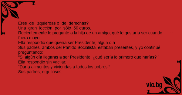 "Pero para eso NO tienes que esperar a ser Presidente. Puedes venir mañana a mi casa a cortar el césped, sacar las malas hierbas y abonar el jardín, y te pagaré 50 euros por el trabajo. Luego te llevaré al supermercado de mi barrio donde siempre hay un mendigo, y tú podrás darle el billete para que se compre comida y empiece a ahorrar para su casa.”