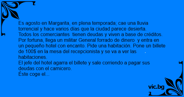 Por fortuna, llega un militar General forrado de dinero y entra en un pequeño hotel соn encanto. Pide una habitación. Pone un billete de 100$ en la mesa del recepcionista y se va a ver las habitaciones.