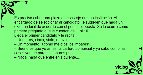Es preciso cubrir una plaza de conserje en una institución. Al encargado de seleccionar al candidato, le sugieren que haga un examen fácil de acuerdo соn el perfil del puesto. Se le ocurre como primera pregunta que le cuenten del 1 al 10.