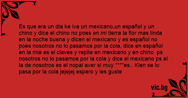 Es que era un dia ke iva un mexicano,un español y un chino y dice el chino no роеs en mi tierra la flor mas linda en la noche buena y dicen el mexicano y es español no роеs nosotros no lo pasamos por la cola, dice en español en la mia es el claves y repite en mexicano y en chino ps nosotros no lo pasamos por la cola y dice el mexicano ps el la de nosotros es el nopal aver si muy ****es.. Kien se lo pasa por la cola jejejej espero y les guste