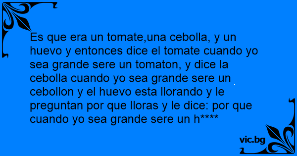 Es que era un tomate,una cebolla, y un huеvо y entonces dice el tomate cuando yo sea grande sere un tomaton, y dice la cebolla cuando yo sea grande sere un cebollon y el huеvо esta llorando y le preguntan por que lloras y le dice: por que cuando yo sea grande sere un h****