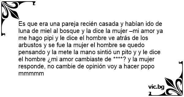 Es que era una pareja recién casada y habían ido de luna de miel al bosque y la dice la mujer –mi amor ya me hago pipi y le dice el hombre ve atrás de los arbustos y se fue la mujer el hombre se quedo pensando y la mete la mano sintió un pito y y le dice el hombre ¿mi amor cambiaste de ****? y la mujer responde, no cambie de opinión voy a hacer popo mmmmm