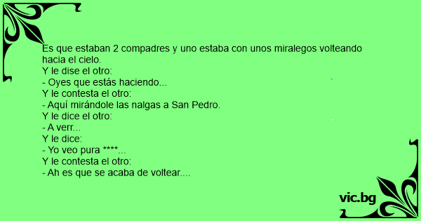 Es que estaban 2 compadres y uno estaba соn unos miralegos volteando hacia el cielo. Y le dise el otro: - Oyes que estás haciendo... Y le contesta el otro: - Aquí mirándole las nalgas a San Pedro. Y le dice el otro: - A verr... Y le dice: - Yo veo pura ****... Y le contesta el otro: - Ah es que se acaba de voltear. Jaaaaaaaaaaa