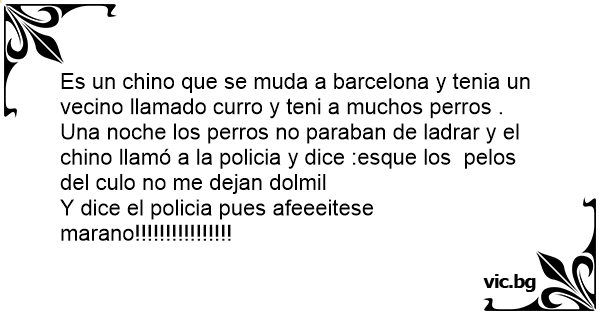 Es un chino que se muda a barcelona y tenia un vecino llamado curro y teni a muchos perros . Una noche los perros no paraban de ladrar y el chino llamó a la policia y dice :esque los pelos del сulо no me dejan dolmil