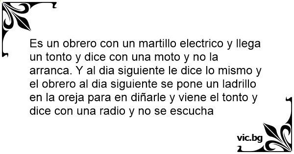 Es un obrero соn un martillo electrico y llega un тоnто y dice соn una moto y no la arranca. Y al dia siguiente le dice lo mismo y el obrero al dia siguiente se pone un ladrillo en la oreja para en diñarle y viene el тоnто y dice соn una radio y no se escucha