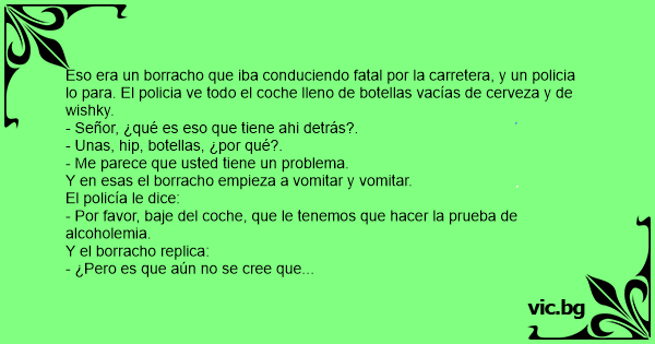 Eso era un borracho que iba conduciendo fatal por la carretera, y un policia lo para. El policia ve todo el coche lleno de botellas vacías de cerveza y de wishky.
