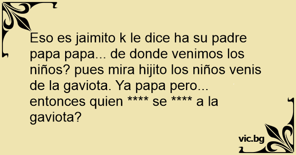 Eso es jaimito k le dice ha su padre papa papa... de donde venimos los niños? pues mira hijito los niños venis de la gaviota. Ya papa pero... entonces quien **** se **** a la gaviota?