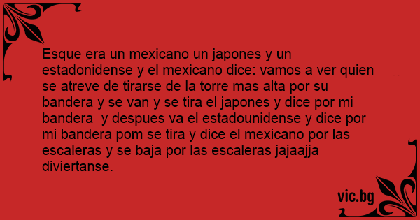 Esque era un mexicano un japones y un estadonidense y el mexicano dice: vamos a ver quien se atreve de tirarse de la torre mas alta por su bandera y se van y se tira el japones y dice por mi bandera y despues va el estadounidense y dice por mi bandera pom se tira y dice el mexicano por las escaleras y se baja por las escaleras jajaajja diviertanse.