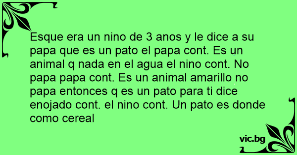 Esque era un nino de 3 anos y le dice a su papa que es un pato el papa cont. Es un animal q nada en el agua el nino cont. No papa papa cont. Es un animal amarillo no papa entonces q es un pato para ti dice enojado cont. el nino cont. Un pato es donde como cereal