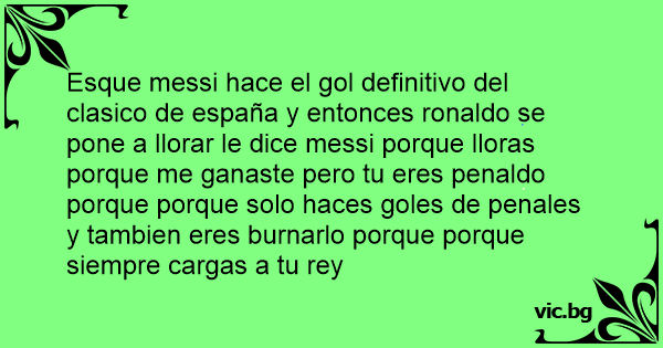 Esque messi hace el gol definitivo del clasico de españa y entonces ronaldo se pone a llorar le dice messi porque lloras porque me ganaste pero tu eres penaldo porque porque solo haces goles de penales y tambien eres burnarlo porque porque siempre cargas a tu rey