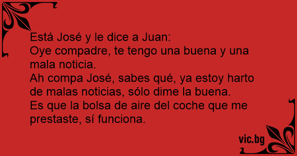 Ah compa José, sabes qué, ya estoy harto de malas noticias, sólo dime la buena.