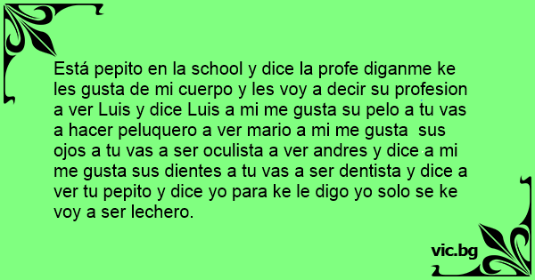 Está pepito en la school y dice la profe diganme ke les gusta de mi cuerpo y les voy a decir su profesion a ver Luis y dice Luis a mi me gusta su pelo a tu vas a hacer peluquero a ver mario a mi me gusta sus ojos a tu vas a ser oculista a ver andres y dice a mi me gusta sus dientes a tu vas a ser dentista y dice a ver tu pepito y dice yo para ke le digo yo solo se ke voy a ser lechero.