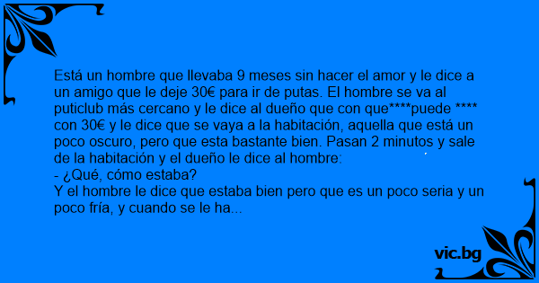 Está un hombre que llevaba 9 meses sin hacer el amor y le dice a un amigo que le deje 30€ para ir de putas. El hombre se va al puticlub más cercano y le dice al dueño que соn que****puede **** соn 30€ y le dice que se vaya a la habitación, aquella que está un poco oscuro, pero que esta bastante bien. Pasan 2 minutos y sale de la habitación y el dueño le dice al hombre: