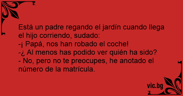 Está un padre regando el jardín cuando llega el hijo corriendo, sudado: -¡ Papá, nos han robado el coche! -¿ Al menos has podido ver quién ha sido? - No, pero no te preocupes, he anotado el número de la matrícula.