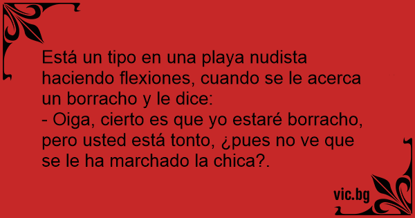 Está un tipo en una playa nudista haciendo flexiones, cuando se le acerca un borracho y le dice: