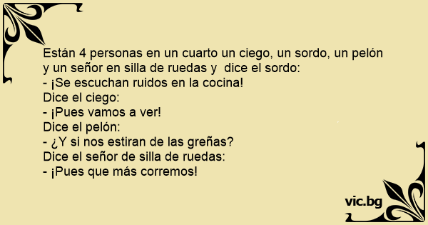 Están 4 personas en un cuarto un ciego, un sordo, un pelón y un señor en silla de ruedas y dice el sordo: