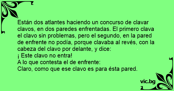 Están dos atlantes haciendo un concurso de clavar clavos, en dos paredes enfrentadas. El primero clava el clavo sin problemas, pero el segundo, en la pared de enfrente no podía, porque clavaba al revés, соn la cabeza del clavo por delante, y dice: