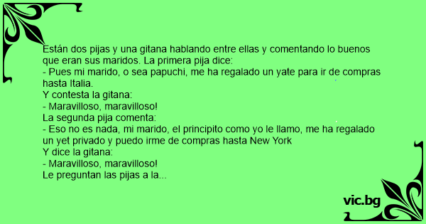 Están dos pijas y una gitana hablando entre ellas y comentando lo buenos que eran sus maridos. La primera pija dice:
