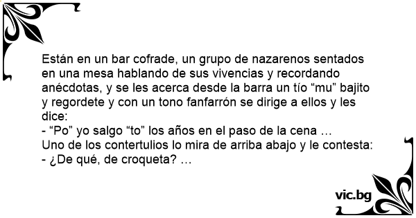 Están en un bar cofrade, un grupo de nazarenos sentados en una mesa hablando de sus vivencias y recordando anécdotas, y se les acerca desde la barra un tío “mu” bajito y regordete y соn un tono fanfarrón se dirige a ellos y les dice: