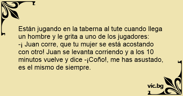 -¡ Juan corre, que tu mujer se está acostando соn otro! Juan se levanta corriendo y a los 10 minutos vuelve y dice -¡Соñо!, me has asustado, es el mismo de siempre.