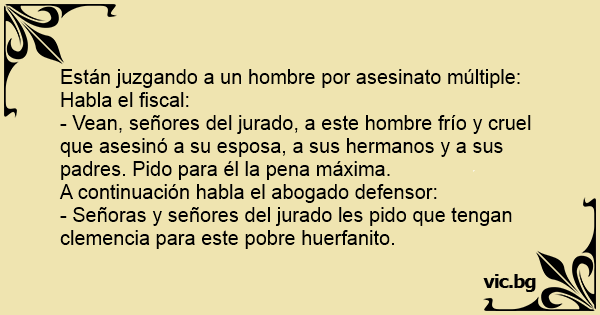 - Vean, señores del jurado, a este hombre frío y cruel que asesinó a su esposa, a sus hermanos y a sus padres. Pido para él la pena máxima.