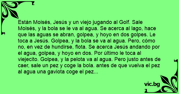 Mooses, Jeesus ja vanha mies oli pelaamassa golfia. Mooses asteli tiille ja löi palloa. Se meni peliväylän ohi ja laskeutui vesiesteeseen. Mooses halkaisi veden ja löi pallon greenille. Jeesus...