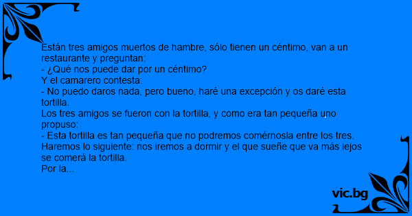 Están tres amigos muertos de hambre, sólo tienen un céntimo, van a un restaurante y preguntan: