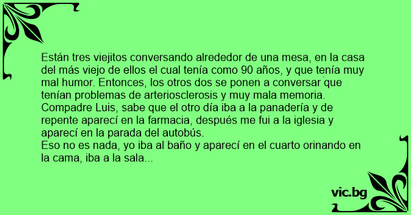 Están tres viejitos conversando alrededor de una mesa, en la casa del más viejo de ellos el cual tenía como 90 años, y que tenía muy mal humor. Entonces, los otros dos se ponen a conversar que tenían problemas de arteriosclerosis y muy mala memoria.