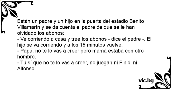 - Ve corriendo a casa y trae los abonos - dice el padre -. El hijo se va corriendo y a los 15 minutos vuelve: