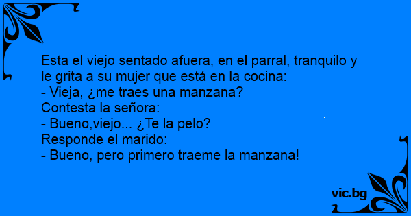 Esta el viejo sentado afuera, en el parral, tranquilo y le grita a su mujer que está en la cocina: