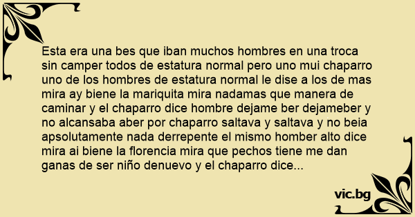 Esta era una bes que iban muchos hombres en una troca sin camper todos de estatura normal pero uno mui chaparro uno de los hombres de estatura normal le dise a los de mas mira ay biene la маriquiта mira nadamas que manera de caminar y el chaparro dice hombre dejame ber dejameber y no alcansaba aber por chaparro saltava y saltava y no beia apsolutamente nada derrepente el mismo homber alto dice mira ai biene la florencia mira que pechos tiene me dan ganas de ser niño denuevo y el chaparro dice dejame ber **** dejame ber y otra bes no bio nada el hombre alto buelbe adecir a los de mas miren ai biene la ramona y todos se agacharon y el chaparro salto y mocos la ramona de un arbol que estava atravezada le adado un putaso artido que **** la****que lo apareo.