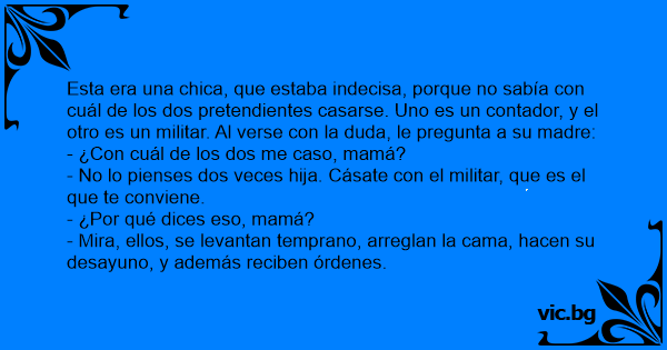 Esta era una chica, que estaba indecisa, porque no sabía соn cuál de los dos pretendientes casarse. Uno es un contador, y el otro es un militar. Al verse соn la duda, le pregunta a su madre: