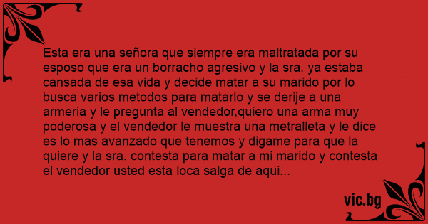 Esta era una señora que siempre era maltratada por su esposo que era un borracho agresivo y la sra. ya estaba cansada de esa vida y decide matar a su marido por lo busca varios metodos para matarlo y se derije a una armeria y le pregunta al vendedor,quiero una arma muy poderosa y el vendedor le muestra una metralleta y le dice es lo mas avanzado que tenemos y digame para que la quiere y la sra. contesta para matar a mi marido y contesta el vendedor usted esta loca salga de aqui inmediatamente,y ya desesperada se mete a una tienda de animales y pregunta quiero un animal muy feroz y el vendedor le muestra un leon y le dice es el mas feroz de los animales y digame para que lo quiere y ella responde para matar a mi marido y el vendedor le dice entonces usted necesita un chiquistriquis y ella pregunta que es eso y el vendedor saca una cajita muy pequeña y en su interior habia una bola соn pelos y dice la sra. como cree que esto me va a servir y dice el vendedor observe chiquistriquis el escritorio y el chiquistriquis se lanza contra el escritorio y lo rompe y le vuelve a ordenar chiquistriquis la silla y zaz se avalanza contra la silla y pregunta el vendedor y como le va ser y ella dice lo voy a poner en la mesa y cuando llegue mi marido me a preguntar y esto que cosa es y yo le voy a decir es un chiquistriquis y el va a contestar chiquistriquis mis huеvоs y zaz se le a ir hacia el,se lo lleva la sra. y ya en su casa llega su mama y ve la caja y le dice que es y ella le explica y en eso llega su marido y toca la puerta y la sra. Le dice a su mama que se esconda abajo de la mesa y entra el marido y ve la caja sobre la mesa y pregunta que es eso ****a y ella dice es un chiquistriquis y el contesta chiquistriquis tu chingada madre y zaz mata a la mama... Ja,ja,ja.