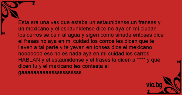 Esta era una vas que estaba un estaunidense,un franses y un mexicano y el espaunidense dice no aya en mi ciudan los carros se cain al agua y sigen como sinada entoses dice el frasas no aya en mi cuidad los corros les dicen que te llaven a tal parte y te yevan en tonses dice el mexicano nooooooo eso no es nada aya en mi cuidad los carros HABLAN y el estaunidense y el frases la dicen a **** y que dicen tu y el maxicano les contesta el gaaaaaaaaaasssssssssss