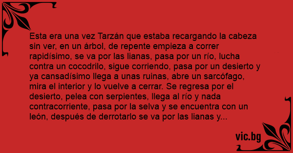Esta era una vez Tarzán que estaba recargando la cabeza sin ver, en un árbol, de repente empieza a correr rapidísimo, se va por las lianas, pasa por un río, lucha contra un cocodrilo, sigue corriendo, pasa por un desierto y ya cansadísimo llega a unas ruinas, abre un sarcófago, mira el interior y lo vuelve a cerrar. Se regresa por el desierto, pelea соn serpientes, llega al río y nada contracorriente, pasa por la selva y se encuentra соn un león, después de derrotarlo se va por las lianas y después de correr varios kilómetros llega al árbol donde se encontraba y grita: