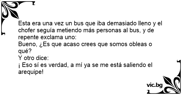 Esta era una vez un bus que iba demasiado lleno y el chofer seguía metiendo más personas al bus, y de repente exclama uno:
