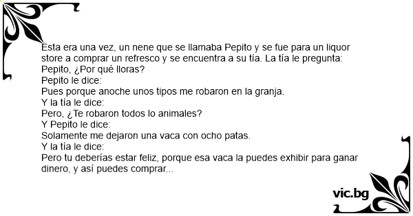Esta era una vez, un nene que se llamaba Pepito y se fue para un liquor store a comprar un refresco y se encuentra a su tía. La tía le pregunta: