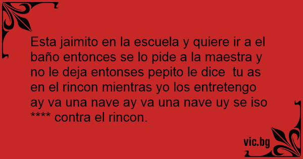 Esta jaimito en la escuela y quiere ir a el baño entonces se lo pide a la maestra y no le deja entonses pepito le dice tu as en el rincon mientras yo los entretengo ay va una nave ay va una nave uy se iso **** contra el rincon.