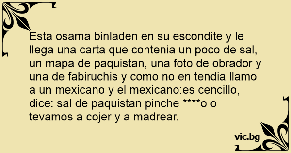 Esta osama binladen en su escondite y le llega una carta que contenia un poco de sal, un mapa de paquistan, una foto de obrador y una de fabiruchis y como no en tendia llamo a un mexicano y el mexicano:es cencillo, dice: sal de paquistan рinсhе ****o o tevamos a cojer y a madrear.