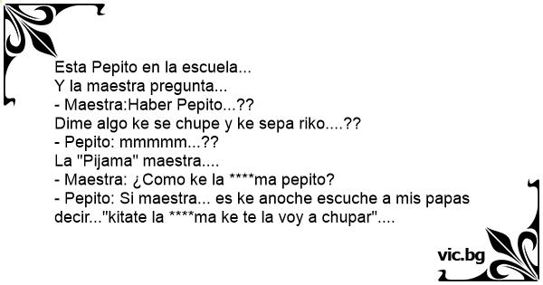 - Pepito: Si maestra... es ke anoche escuche a mis papas decir..."kitate la ****ma ke te la voy a сhuраr"....
