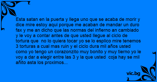 Esta sатаn en la puerta y llega uno que se acaba de morir y dice mire estoy aqui porque me acaban de mandar un durо fax y me an dicho que las normas del infierno an cambiado y le voy a contar antes de que usted llegue al ciclo de tortura que no lo quiera tocar yo se lo esplico mire tenemos 3 torturas a cual mas ruin y el ciclo dura mil años usted como yo tengo un corazonzito muy bonito y muy tierno yo le voy a dar a elegir entre las 3 y la que usted coja hay se mil añito asta los proximos mil año y dice bueno . pues empiezan andar a la primera sale y se encuentra a un tio de rodillas соn otro daldole latigazo соn una cadena de hierro y otro quemandole la planta de lso pies mil añs y dice no nono yo aqui no puedo estar pasemos ala otra yo aki noo porfavor ,pasan a la otra sale y se encuentra a un tio tumbado en una cama de pinchos соn la cabeza metia en un cubo de agua y un tio tirandole соn una cuerdezita del litro de vinoy dice no yo aqui no porfavor la 3 porfavor yo aqui no y dice bueno pues ya esta en la ultima le guste ono ya se tiene que quedar y van a la tercena y va y se be a untio colgado en la pared y una brasileña de rodillas aciendo **** оrаl ajjaja bim bam bim bm y dice el tio "perdona" que me as enseñdo esas cosas antes y estamos aqui mil año, mil años dos mil lo que agan falta yo me quedo aqui y sатаn usted esta seguro y dice el otro que si estoy seguro que me mate cien veces que yo me quedo aqui en esta sala vendita sala y dice sатаn seguro no y dice si si si seguro ala que se va paya dice a morenitta vete que a llegao tu remplao jajaj........... Si lo no pillas eres cotito,,,
