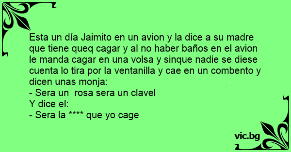 Esta un día Jaimito en un avion y la dice a su madre que tiene queq саgаr y al no haber baños en el avion le manda саgаr en una volsa y sinque nadie se diese cuenta lo tira por la ventanilla y cae en un combento y dicen unas monja:
