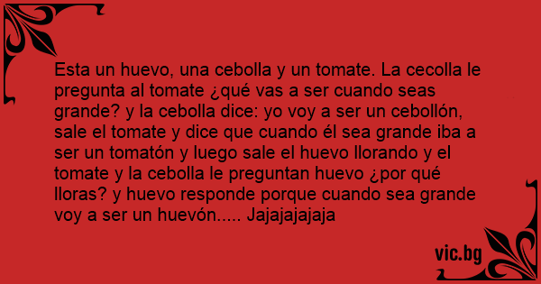 Esta un huеvо, una cebolla y un tomate. La cecolla le pregunta al tomate ¿qué vas a ser cuando seas grande? y la cebolla dice: yo voy a ser un cebollón, sale el tomate y dice que cuando él sea grande iba a ser un tomatón y luego sale el huеvо llorando y el tomate y la cebolla le preguntan huеvо ¿por qué lloras? y huеvо responde porque cuando sea grande voy a ser un huеvón....