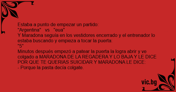 Estaba a punto de empezar un partido: "Argentina" vs "eua" Y Maradona seguía en los vestidores encerrado y el entrenador lo estaba buscando y empieza a tocar la puerta: "5" Minutos después empezó a patear la puerta la logra abrir y ve colgado a MARADONA DE LA REGADERA Y LO BAJA Y LE DICE POR QUE TE QUERIAS SUICIDAR Y MARADONA LE DICE: - Porque la pasta decía colgate.