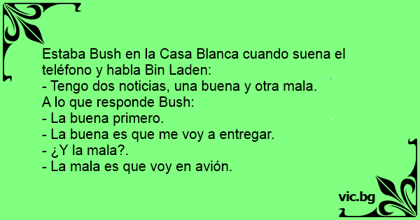 Osama Bin Laden en George W. Bush hebben een telefoongesprek. Osama zegt: "Ik heb goed en slecht nieuws, wat wil je eerst horen?" Bush antwoordt: "Het goede nieuws." "Oké," zegt Osama, "Ik geef me...