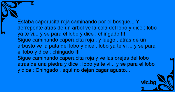 Estaba caperucita roja caminando por el bosque... Y derrepente atras de un arbol ve la cola del lobo y dice : lobo ya te vi... y se para el lobo y dice : chingado !!!