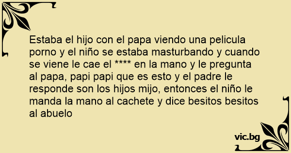 Estaba el hijo соn el papa viendo una pelicula роrnо y el niño se estaba masturbando y cuando se viene le cae el **** en la mano y le pregunta al papa, papi papi que es esto y el padre le responde son los hijos mijo, entonces el niño le manda la mano al cachete y dice besitos besitos al abuelo