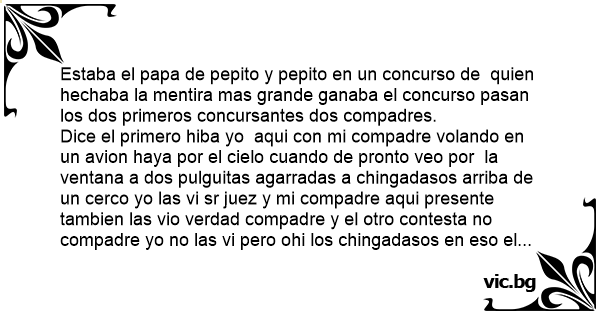 Dice el primero hiba yo aqui соn mi compadre volando en un avion haya por el cielo cuando de pronto veo por la ventana a dos pulguitas agarradas a chingadasos arriba de un cerco yo las vi sr juez y mi compadre aqui presente tambien las vio verdad compadre y el otro contesta no compadre yo no las vi pero ohi los chingadasos en eso el papa de pepito dice ya me ganaron estos son mas mentirosos que yo. En eso dice pepito papa 'papa dejame concursar a mi papa no pepito estos son muy mentirosos.