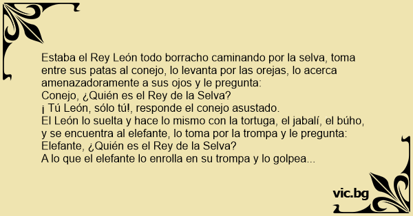 Estaba el Rey León todo borracho caminando por la selva, toma entre sus patas al conejo, lo levanta por las orejas, lo acerca amenazadoramente a sus ojos y le pregunta: