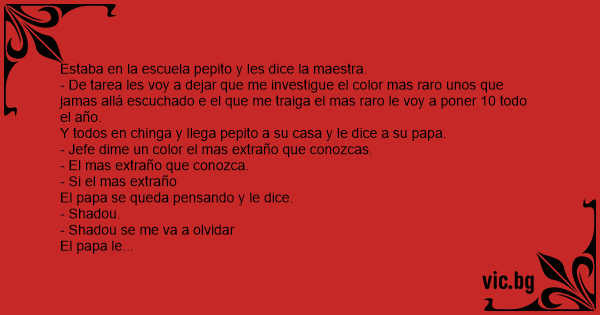 - De tarea les voy a dejar que me investigue el color mas raro unos que jamas allá escuchado e el que me traiga el mas raro le voy a poner 10 todo el año.